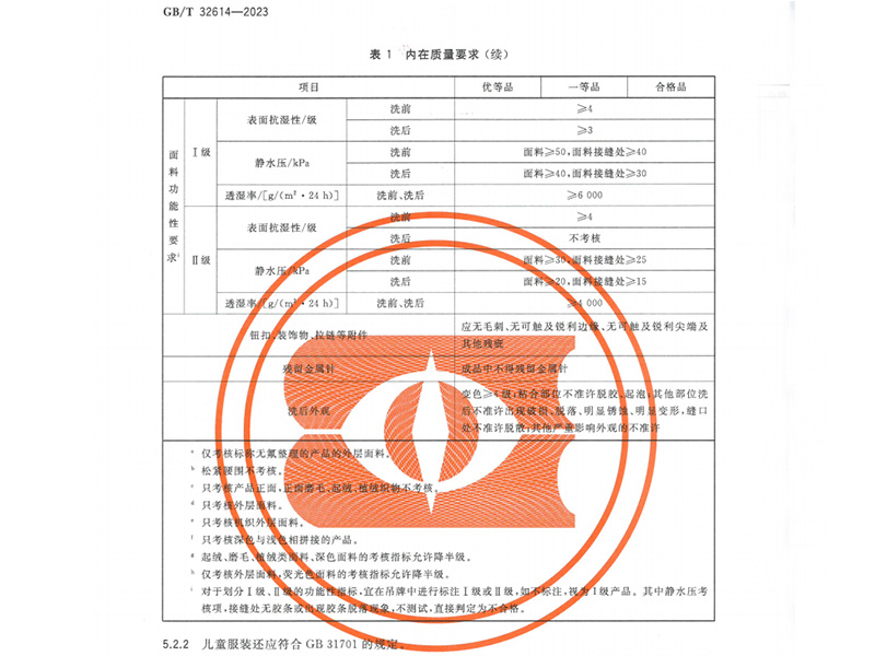 新標準增設無氟整理產品的檢測規范,并對兒童沖鋒衣提出更嚴格的安全要求,必須符合《嬰幼兒及兒童紡織產品安全技術規范》。這體現了國家標準對健康環保的重視,引導沖鋒衣加工行業向綠色生產轉型。